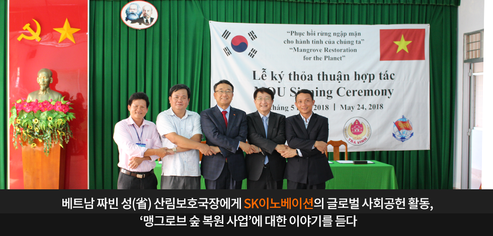 그 첫걸음으로 지난 5월 24일, SK이노베이션은 베트남 정부(짜빈 성(省) 인민위원회 및 산림보호국)와 유엔환경계획(UNEP), 베트남 화물물류기업 1위인 SNP(Saigon Newport Corporation) 등과 함께 ‘맹그로브 숲 복원’을 위한 협약을 체결하였습니다.