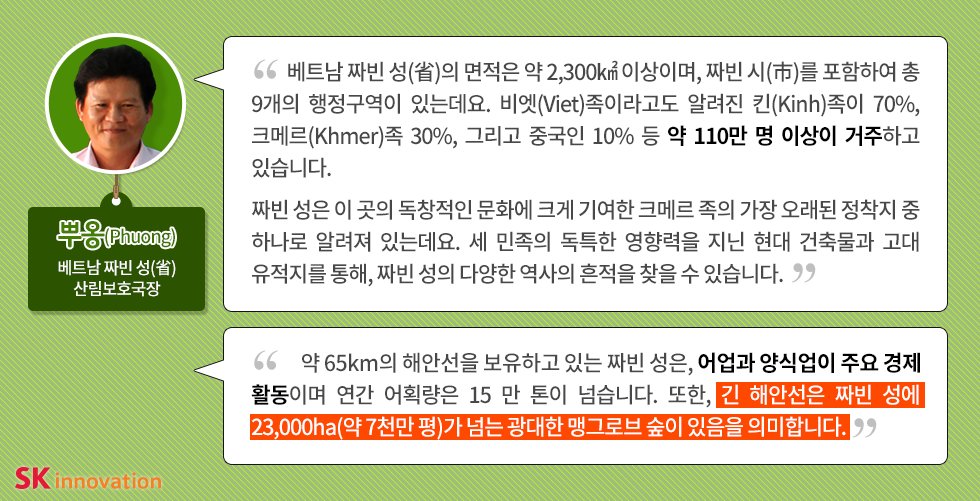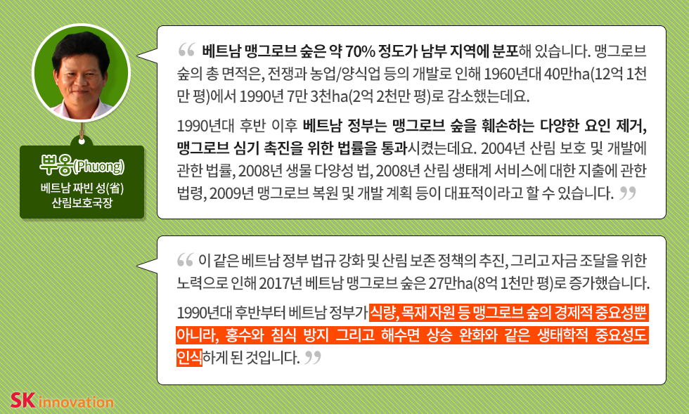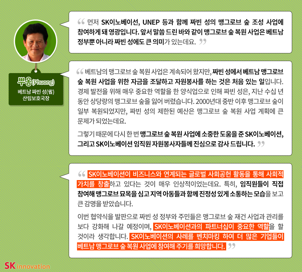 협약식 체결 후, 베트남 짜빈 성 뿌옹(Phuong) 산림보호국장에게 SK이노베이션의 글로벌사회공헌 활동인 ‘맹그로브 숲 복원 사업’에 대한 이야기를 들어 보았습니다.