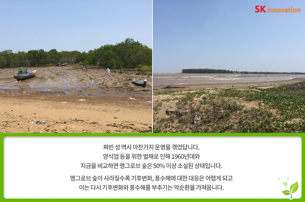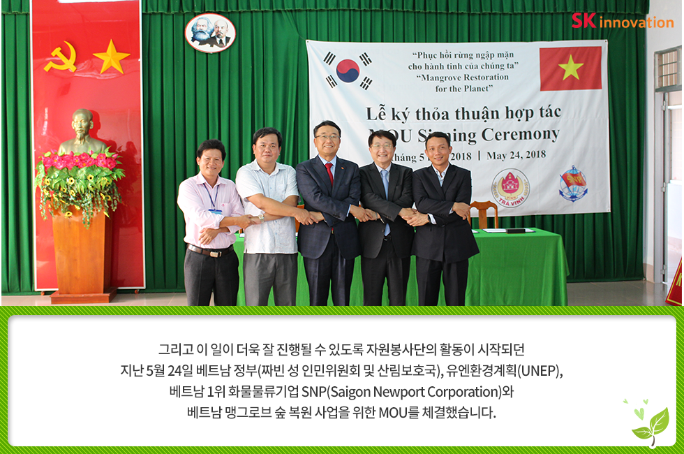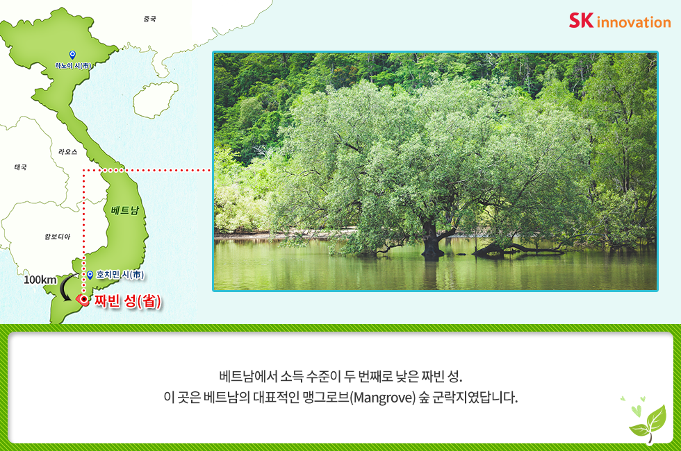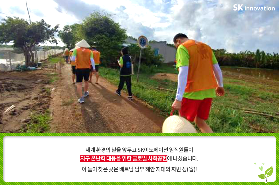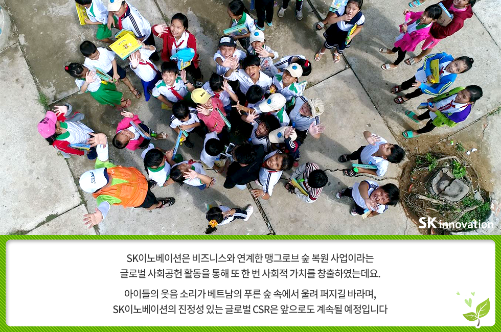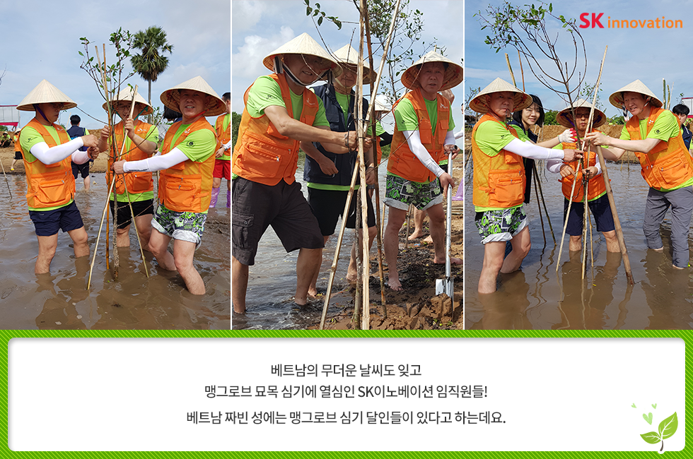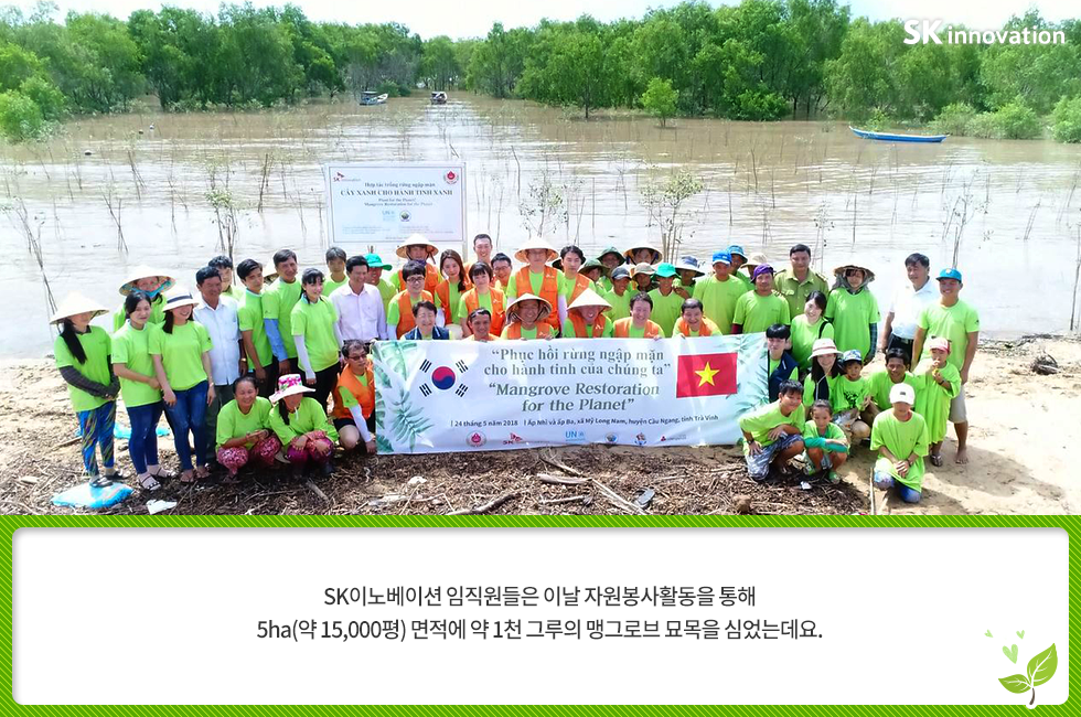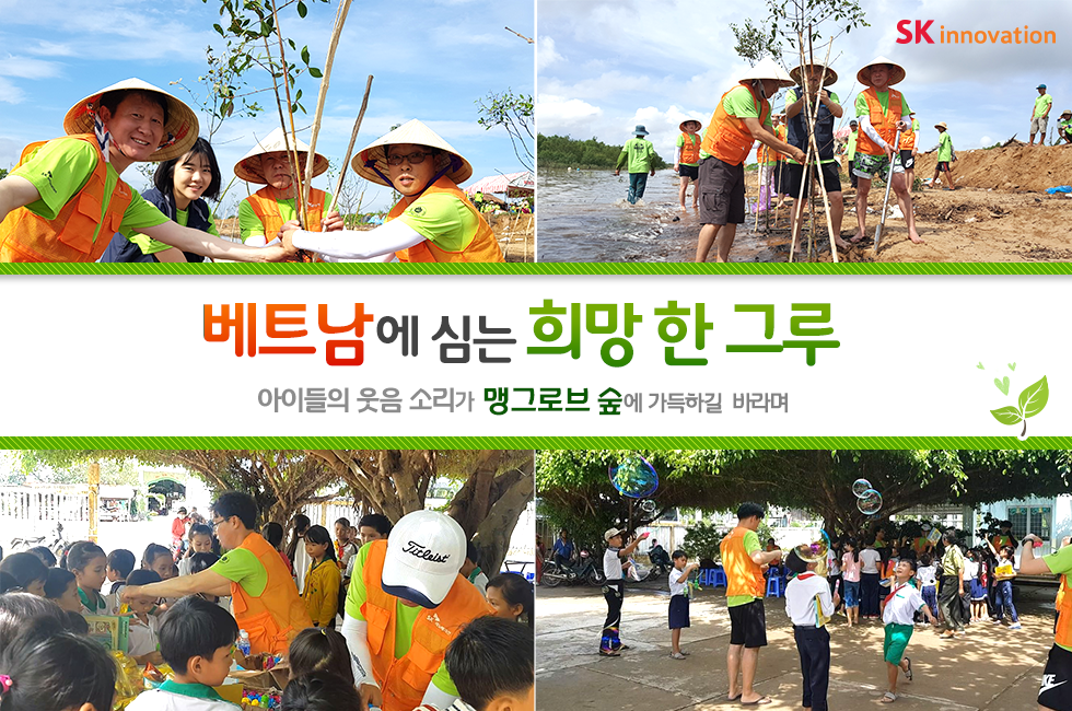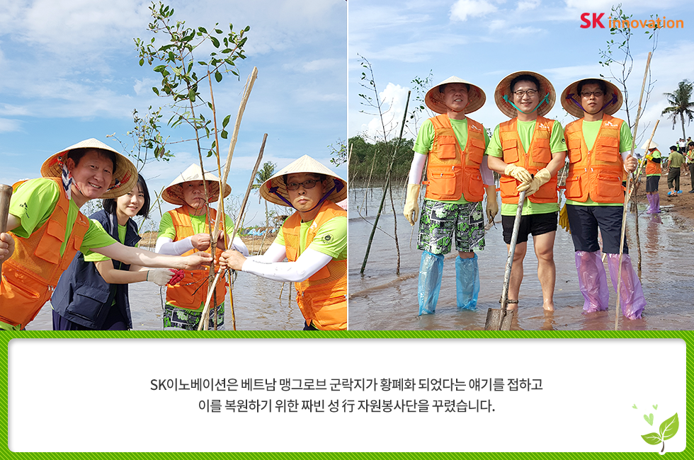 베트남에 심는 희망 한 그루 – 아이들의 웃음 소리가 맹그로브 숲에 가득하길 바라며 2018. 05. 28 SK이노베이션 베트남에 심는 희망 한 그루 – 아이들의 웃음 소리가 맹그로브 숲에 가득하길 바라며 AI 요약 AI 보이스 6월 5일, 세계환경의 날을 앞두고 SK이노베이션 임직원들이 지구 온난화 대응을 위한 글로벌 사회공헌 활동에 나섰습니다. 베트남 짜빈(Tra Vinh) 성(省)에 희망을 심고 온 SK이노베이션 임직원들을 지금 만나 보세요! 미디어 키트 이전글 1% 행복나눔 SK이노베이션 맹그로브 베트남 사회공헌 사회적가치 해외봉사 다음글 연관 콘텐츠 PRESS 아낌없이 주는 나무 ‘Mangrove’… 공존하며 지속가능한 세상을 만들어 갈 기회를 찾다 2023.05.11 PRESS 기후변화 대응 및 생물다양성 보존의 핵심 ‘맹그로브 숲 복원사업’… SK이노베이션, 코로나 팬데믹 속에서도 계속한다 2021.06.24 PRESS 맹그로브 식수 활동, 2018 ‘기업과 생물다양성 플랫폼(BNBP)’ 우수 사례 선정 2019.07.17 PRESS SK이노베이션, 노사(勞使)가 손잡고 베트남 맹그로브 숲 복원 현장을 찾다 – 제5차 맹그로브 묘목 식수 봉사활동 2019.04.24