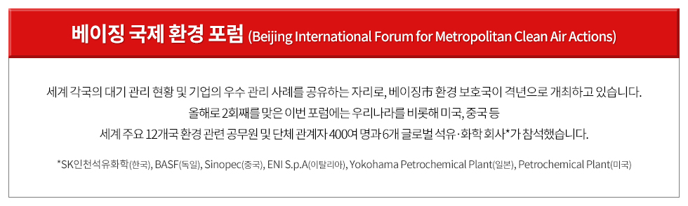 이번 포럼에 SK인천석유화학이 초청받은 것은 지난 3월, 한국을 방문한 베이징시 환경보호국 일행들이 환경 관리 시스템에 대한 벤치마킹으로 SK인천석유화학을 방문했던 것이 계기가 되었는데요. 당시 SK인천석유화학의 환경 관리 시스템, 관련 시설 현황과 사례에 대한 설명을 들은 베이징시 환경 보호국 관계자들이 국제 포럼에서 공유하자는 제안을 해서 성사된 것입니다.