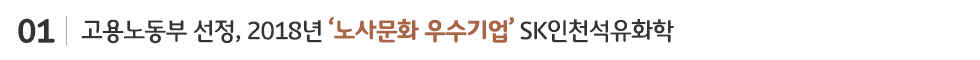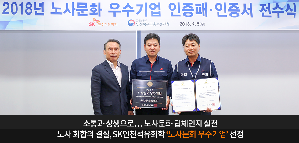 상호 신뢰의 노사(勞使)문화를 바탕으로 협력사 동반성장 및 지역사회와의 상생에 앞장서 온 SK이노베이션의 자회사 SK인천석유화학이 고용노동부 주관 ‘2018년도 노사문화 우수기업’에 선정됐습니다.