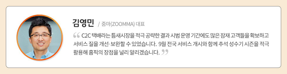 홈픽은 지난 4월 런칭 이후 시범 운영 기간 동안 높은 고객 호응도를 바탕으로 홈쇼핑 업체 반품 택배 서비스 제휴, 중고거래사이트 배송 서비스 제휴 등 다양한 서비스 제휴를 이어가기도 했는데요. 홈픽은 향후 관련 업계와의 제휴를 적극적으로 확대하고 소비자 편의성을 더욱 높여 C2C 택배* 업계 선두주자로 발돋움하겠다는 목표입니다.