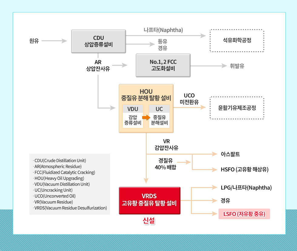 지난 2017년 11월, SK이노베이션의 석유사업 자회사인 SK에너지는 총 1조 원 가량이 투입되는 VRDS(Vacuum Residue Desulfurization, 고유황 중질유 탈황 설비) 신설 계획을 발표했습니다. VRDS는 고유황 연료유인 감압 잔사유를 저유황 중유, 경유 등 고부가 제품으로 전환할 수 있는 설비이며, 2020년 설비가 완공되면 SK이노베이션은 국내 1위의 저유황유 공급자로 도약하게 됩니다.