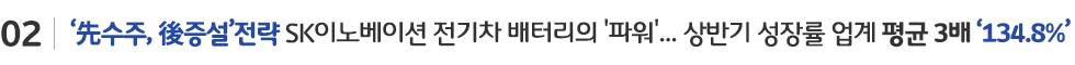 관련 업계에 따르면 최근 시장조사 전문기관인 SNE리서치가 2018년 1월~7월까지 중국을 제외한 전기차 배터리 생산 기업들의 출하량을 분석한 결과 SK이노베이션이 업계 평균 성장률인 54.6%의 3배에 가까운 134.8%의 성장률을 보였다고 발표했다.