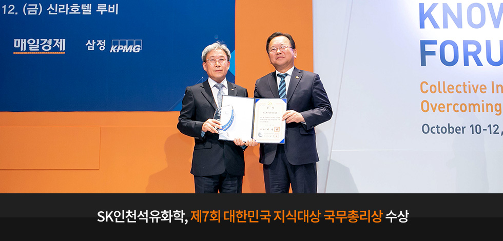지난 10월 12일, SK이노베이션의 자회사 SK인천석유화학이 행정안전부·매일경제신문 등이 공동 주최하는 ‘제7회 대한민국 지식대상’에서 국무총리상을 수상했습니다. 대한민국 지식대상은 지식경영의 새로운 패러다임을 바탕으로 혁신을 이끌어내고, 나아가 한국의 경쟁력을 향상시키는 기업 및 조직에게 수여하는 상입니다.
