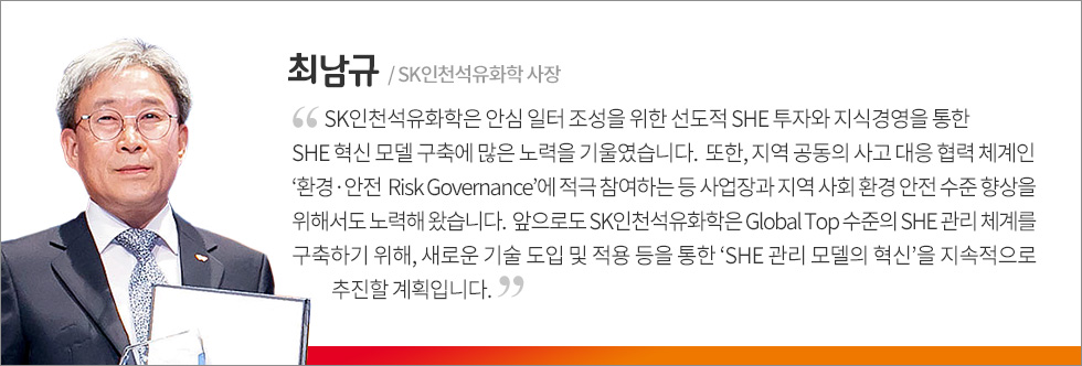 SK인천석유화학은 ‘SHE First 경영’을 바탕으로 한 무재해 추구와 친환경 경영. 그리고 빅데이터, 드론 등 4차 산업혁명 시대에 걸맞은 각종 신기술을 업무 현장에 적극 도입, 활용해 생산시설의 혁신을 이루고자 한다는 점에서 높은 평가를 받아 국무총리상을 수상하게 되었습니다.