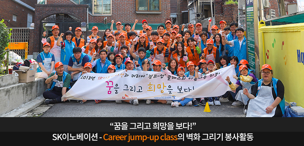바로 SK이노베이션 임직원과 발달장애인 자립 지원 프로그램(Career jump-up class, 이하 CJC)에 참여 중인 발달장애인이 함께 벽화 그리기 봉사활동을 시행한 것인데요. 9월 3일 개강 후 첫 대외 활동을 시작한 CJC의 교육생들과 SK이노베이션 임직원들과의 만남! 첫걸음의 설렘과 열정이 가득했던 현장을 지금 소개합니다.