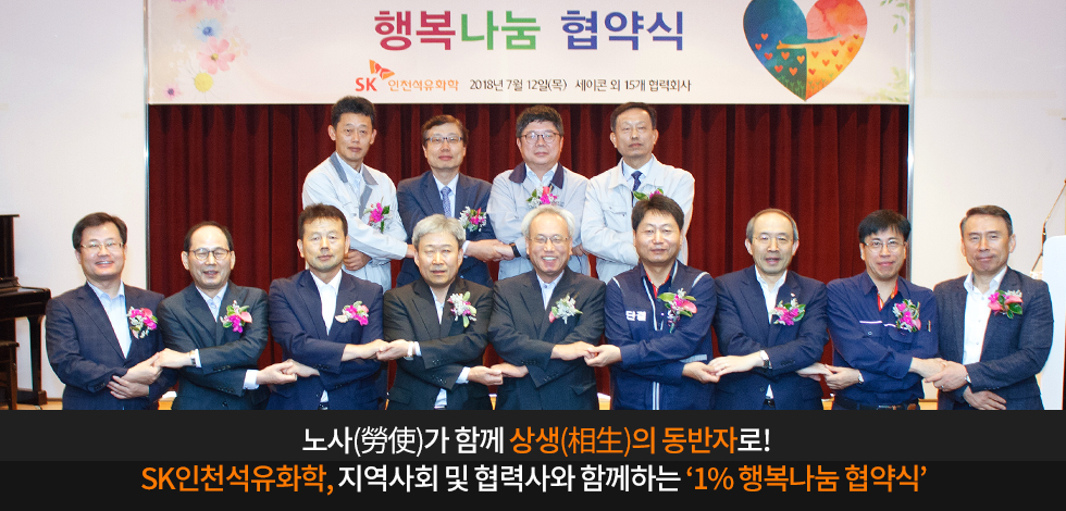 7월 12일 오늘, SK인천석유화학이 본관 1층 비전홀(Vision Hall)에서 협력사 임직원 및 지역 소외계층에게 ‘1% 행복 나눔 모금액’을 전달하는 협약식을 진행했습니다.