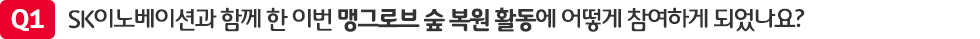 비록 언어의 장벽으로 의사소통에 약간의 어려움은 있었지만, SK이노베이션 임직원분들이 뿜어내는 긍정적인 에너지는 고스란히 느낄 수 있었습니다. 새벽 일찍 식수를 할 때, 저희보다 먼저 준비하고 가장 늦게까지 남아 열심히 식수 활동을 하는 모습에 큰 감동을 받았는데요. 환경 보호에 큰 기여를 하고 있는 SK이노베이션, 다음 프로젝트에도 꼭 함께하고 싶습니다. 또 만나요, SK이노베이션!