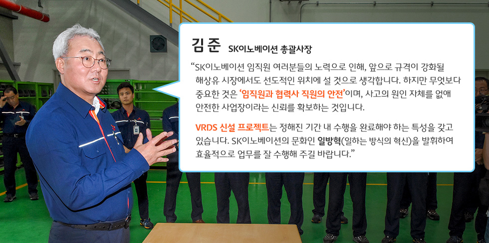 김준 총괄사장은 가장 먼저 VRDS(Vacuum Residue Desulfurization, 감압 잔사유 탈황설비) 신설 공사 현장을 찾았습니다.