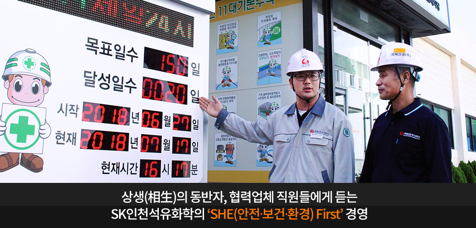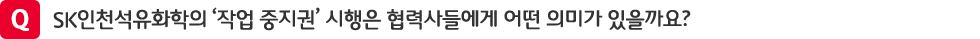 지난 6월 27일, SK인천석유화학 노사(勞使)는 협력사와 함께 ‘안전결의대회’를 개최해 업계 최초로 협력사 ‘무재해 포상제 실시’와 함께 ‘작업 중지권 시행’을 제도화 한 바 있습니다. 이는 SK인천석유화학의 동반성장 파트너인 협력사 직원들의 안전이 회사의 안정적인 성장에 가장 중요한 일이라고 판단하여 안전∙보건∙환경(SHE) 관리 수준을 협력사 임직원들에게도 적용한 것입니다.
