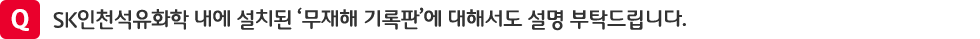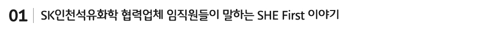 SK인천석유화학은 안전∙보건·환경을 중시하는 ‘SHE(Safety∙Health∙Environment) 경영’을 최우선 과제로 정하고, 이를 위해 안전기술 혁신, 친환경 사업운영 등 더 쾌적하고 안전한 사업장을 만들기 위해 노력하고 있습니다.