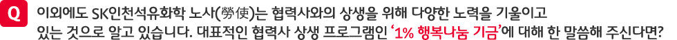 ‘1% 행복나눔 기금’이란, 임직원들이 매달 월급의 1%를 자발적으로 기부하면 회사 역시 동일한 금액을 출연하는 매칭그랜트(Matching Grant)* 방식으로 조성된 기금입니다. 올해는 SK인천석유화학 전체 임직원의 98%가 기금 조성에 동참해, 작년보다 두 배 늘어난 총 5억 2천만 원의 기금을 마련했습니다.