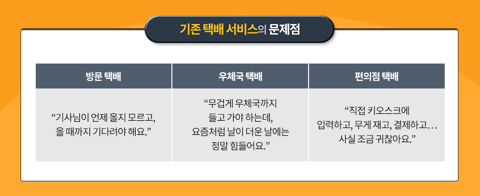 16년간 홈쇼핑, 물류센터, 콜센터 등 물류 유통과 관련된 일을 하면서 ‘최상의 배송 서비스’는 무엇일까에 대한 고민을 해왔습니다. 택배에서 고객들이 자주 불편함을 느끼는 경우는 주로 택배 반품 등의 ‘수거’ 과정이더라고요. 택배사에 수거를 신청할 경우, 택배기사가 2~3일이 지나도 오지 않거나, 고객 상주시간과 기사 방문시간이 맞지 않을 때가 많았고, 우체국이나 편의점에 직접 방문할 경우 이동과 주차의 불편함도 컸고요. 그래서 고객이 원하는 시간에 택배를 보낼 수 있는 서비스를 생각하게 됐습니다.