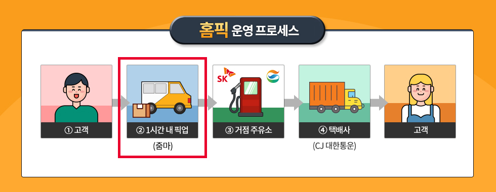 하지만 홈픽으로 주문하면 최대 한 시간 안에 기사가 고객이 원하는 장소로 방문해 물건을 수거하고, 집화한 물건은 접근성이 높은 근처 주유소로 옮겨지기 때문에 택배 집화 비용과 시간이 획기적으로 줄어들게 됩니다.