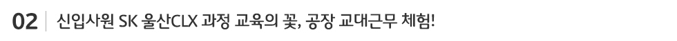 특히 4일 차에 이뤄진 ‘교대근무 체험’은 SK 울산CLX 공정을 직접 체험하는 잊을 수 없는 경험이었는데요. 향후 SK 울산CLX에서 엔지니어로 근무하게 될 사원들에게는 생생한 업무 현장을 미리 경험하고, 본사 및 연구소 등에서 근무할 사원들에게는 평소 접하기 힘든 SK이노베이션의 Value Chain 현장을 직접 체험하는 의미 있는 시간으로 남았습니다.