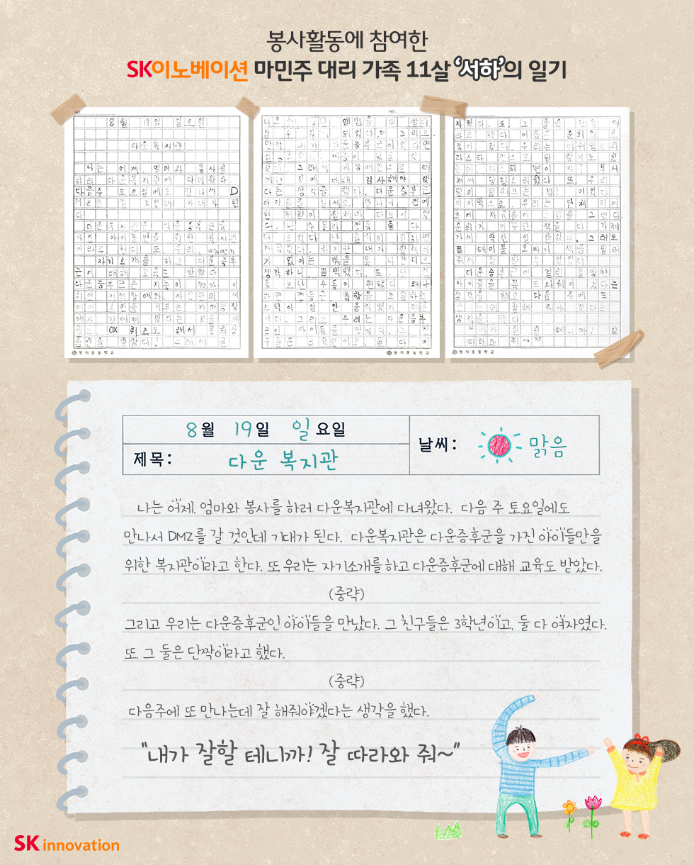 SK이노베이션은 지난 2016년부터 사회공헌 중점 테마 중 하나로 발달장애아동을 선정하여 임직원 자원봉사활동 등 관련 활동을 지속해오고 있습니다. 앞으로도 계속해서 발달장애아동 관련 다양한 사회공헌 활동을 펼쳐나갈 SK이노베이션! 많은 관심과 응원 부탁드립니다.