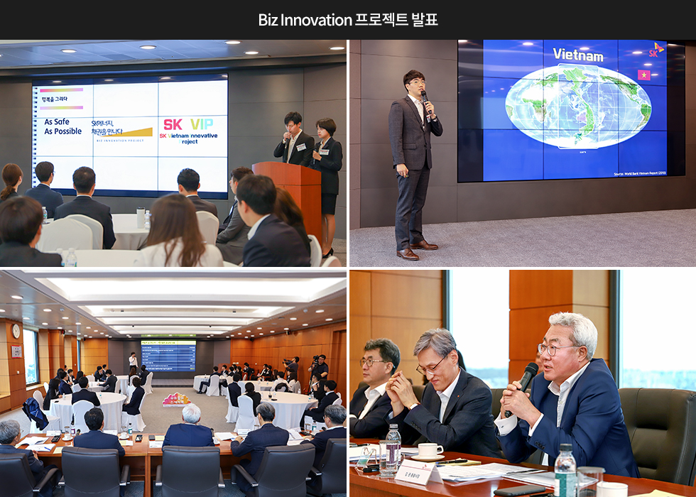 1부의 포인트는 바로, 사회적 가치를 사업에 적용하는 ‘Biz Innovation’ 프로젝트를 발표하는 시간이었는데요! 에코 드라이빙 및 안전 운전자 대상 건전 운전 문화 확대, SK에너지 아스팔트를 활용한 미얀마 도로 인프라 구축, 베트남 No.1 윤활유 사업자 도약하기 위한 방안 등 우수작이 발표되었습니다. CEO들은 진지하게 발표자들의 아이디어를 들은 후, 파트너사의 이익과 지속 가능 경영을 위한 다양한 조언을 해 주셨습니다.