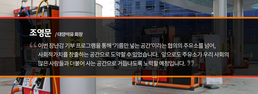 또한 대양석유는 주유소에서 운영하는 장난감 뽑기 등 유외(油外)사업을 통해 얻어지는 수익금 전액을 키니스 장난감 병원 운영을 위한 후원금으로 전달할 예정입니다.