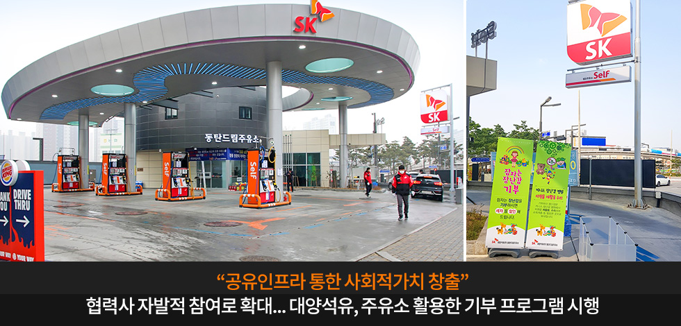 SK에너지의 석유 유통 협력사로 전국 35개 직영주유소를 운영하는 ‘대양석유’가 SK의 공유인프라를 통한 사회적가치 창출에 함께 나섰습니다.