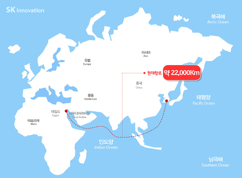 SK이노베이션 유조선은 수에즈막스(Suexmax)급에 해당되며, 중동에서 평균 180만 배럴의 원유를 싣고 오는데 톤으로 환산하게 되면 약 9만 5천 톤입니다. 중동 지역에서 원유를 수입할 때에는 일반적으로 수에즈 운하를 통과해야 하기 때문에 VLCC 혹은 ULCC와 같은 초대형 선박이 아닌 가장 적합한 크기인 수에즈막스급 선박을 이용하고 있습니다.