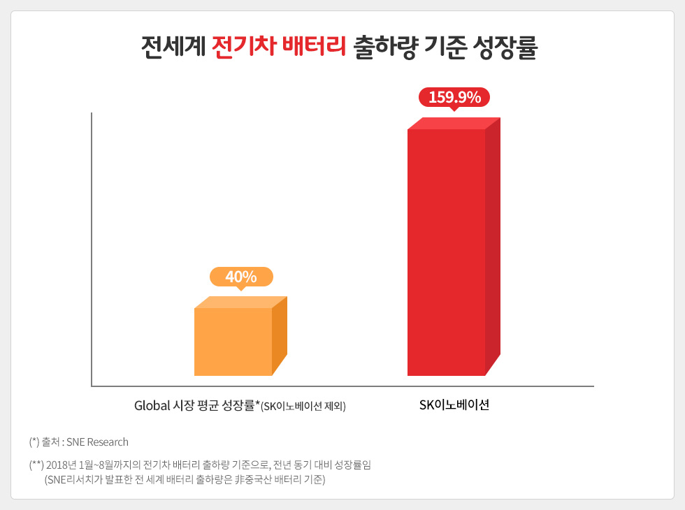 실제로 2018년 1~8월 SK이노베이션의 전기차 배터리 출하량은 총 428.9MWh로, 전년 동기 대비 약 160% 증가하며 글로벌 전기차 배터리 업체 중 가장 높은 성장세를 기록했다.