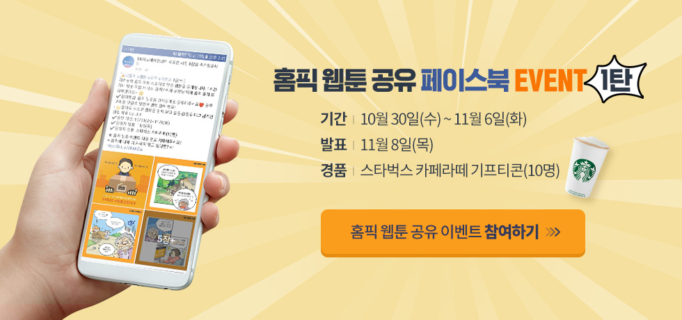 지금 SK이노베이션 페이스북(www.facebook.com/IF.SKinnovation)에서 홈픽 웹툰 1탄 ‘어머니의 사랑을 전합니다’편을 보고 본인의 페이스북에 공유하시면 추첨을 통해 따뜻한 커피를 선물해 드립니다.