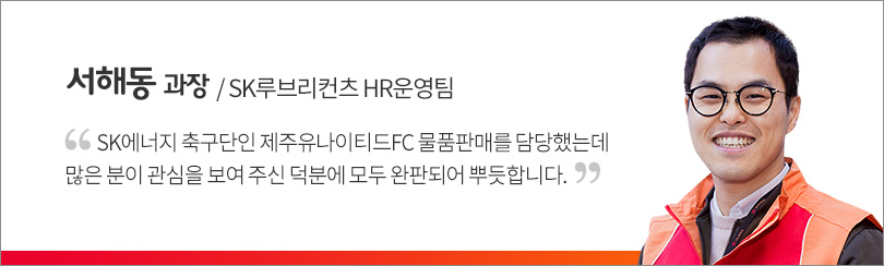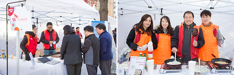 특히, SK이노베이션 판매부스에는 회사가 지원하는 사회적기업 모어댄의 ‘백팩’, 우시산의 ‘텀블러’ 등과 꼬치, 파전 등 다양한 먹거리들, 그리고 제주유나이티드FC와 SK슈가글라이더즈 기증품 등이 판매되어 큰 인기를 끌었다.