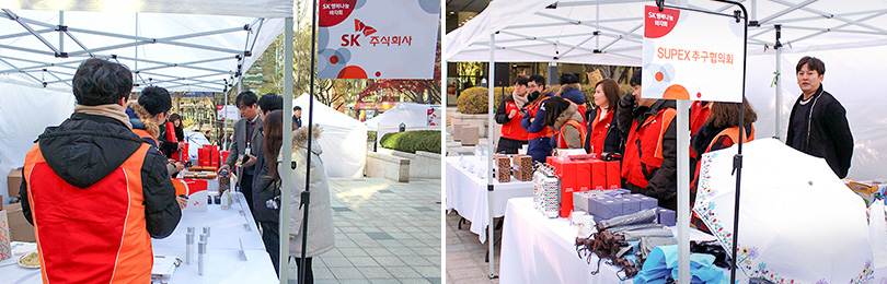 바자회 판매부스에는 SK그룹 각 사가 준비한 기증품이 전시되어 거리를 오가는 시민들의 눈길을 사로잡았다.