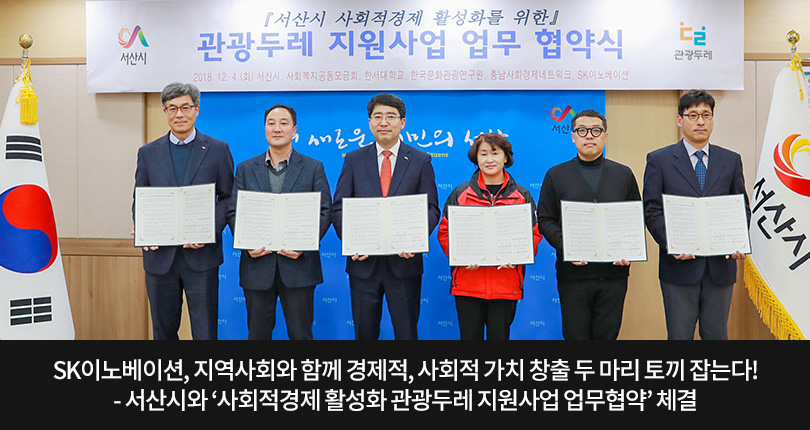 SK이노베이션이 12월 4일 서산시 민∙관∙학의 여러 기관들과 함께 서산지역 사회적 경제 활성화를 위한 관광두레(*) 지원사업 업무협약을 체결했다.