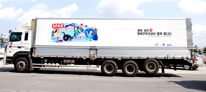 앞으로 화물차들은 제주 지역을 돌아다니면서 한국장애인복지관협회 제주도협회, 제주여성인권상담소협의회 등 사회복지시설 5곳과 폐목재 이용 친환경제품 생산기업 ‘파란하늘’ 등 사회적기업 3곳을 알리는 옥외 광고판 역할을 할 예정입니다.