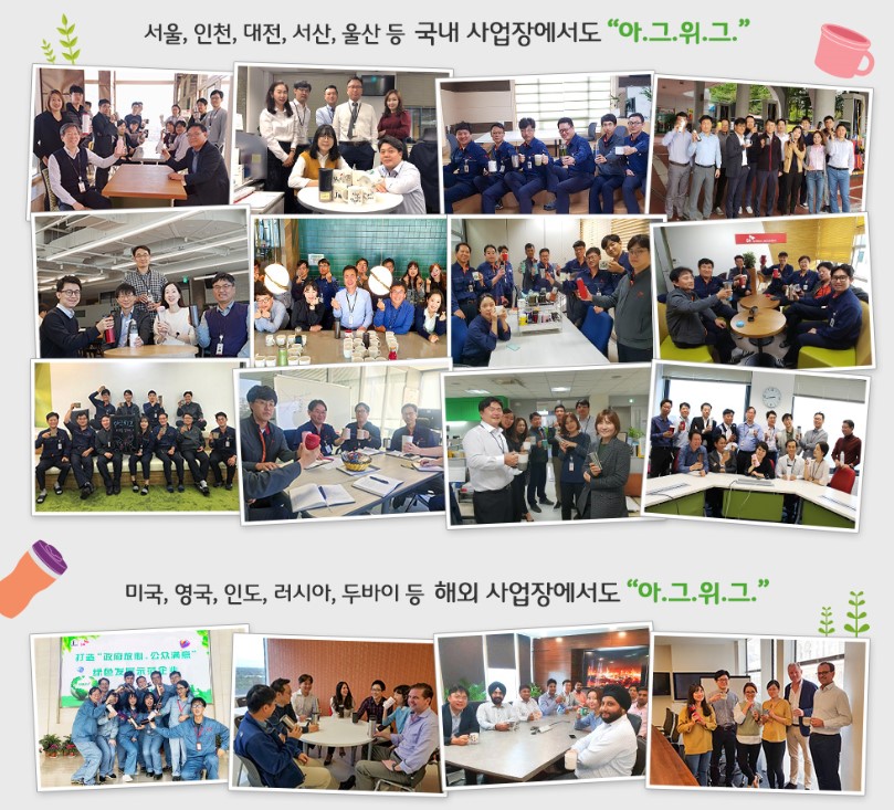 캠페인 시행 후 2주만에 ‘아.그.위.그’의 취지에 공감한 임직원 대다수가 3대 원칙 실천에 동의하였으며, 캠페인 참여 인증샷 릴레이 또한 서울, 인천, 울산 등 국내 사업장을 비롯해 미국, 영국, 인도 등 해외 사업장에서도 활발하게 진행되었다.