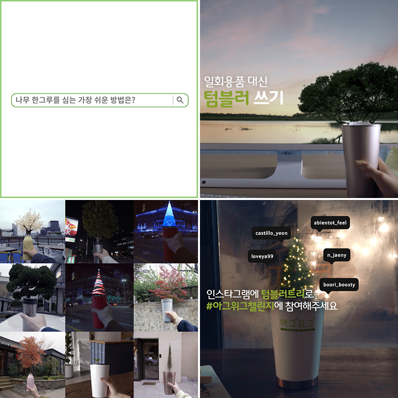 아.그.위.그 챌린지는 일회용품 대신 텀블러 등을 사용한 개인이 텀블러/머그컵과 나무를 함께 촬영한 사진을 본인 인스타그램(Instagram)에 해시태그 ‘#아그위그챌린지’와 함께 게재하면, SK이노베이션이 참여 게시물 수만큼 지구 온난화 대응에 효과적인 맹그로브(**) 묘목을 기부하는 방식으로 진행된다.