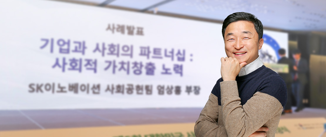 안녕하세요, SK이노베이션 사회공헌팀에서 사회적기업 설립 · 육성 지원과 신규 사회공헌 프로그램 발굴 등의 업무를 담당하고 있는 엄상홍 부장입니다.