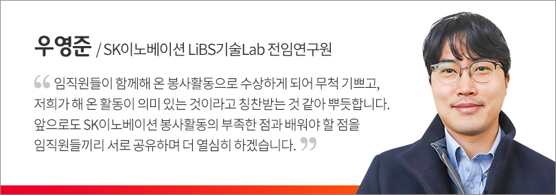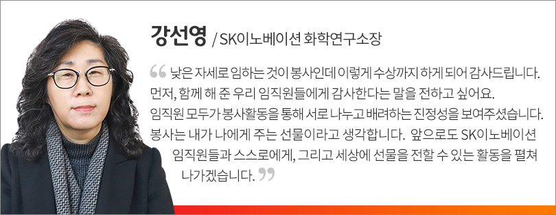 SK이노베이션 이성준 기술혁신연구원장은 “임직원들의 진심이 담긴 사회공헌활동이 회사가 속한 지역사회에서 인정을 받을 수 있어 감사한 마음”이라며, “SK이노베이션 기술혁신연구원 임직원 모두는 앞으로도 독거노인을 포함한 여러 취약계층에 대해 관심을 기울이고 지역사회를 위한 다양한 사회공헌 활동으로 사회적가치 창출에 앞장서겠다”고 말했다.