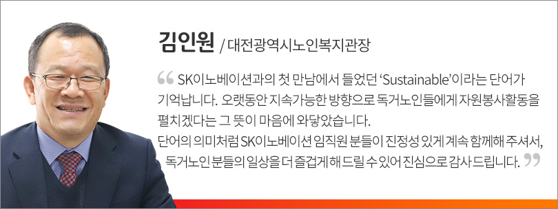 한편, SK이노베이션은 지난 2016년부터 자원봉사활동 테마 중 하나를 ‘취약계층 독거노인’으로 선정하고 임직원과의 결연을 통한 정서적 지지, 주거안전개선, 문화체험 등 다양한 봉사활동을 펼치고 있다.