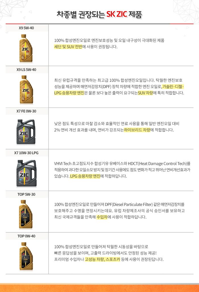 다만, 우리나라 기후와 주행특성을 고려한다면 1만km 정도에는 반드시 엔진오일 상태를 점검하는 것이 좋으며, 일반적으로는 1년에 3~4회의 윤활유 교체를 권장한다. 또한 같은 5,000km에 엔진오일을 교환하더라도 엔진오일 제품에 따라 차량 상태의 정도가 다르다는 점을 유념해야 한다. 성능이 뛰어난 ZIC 제품을 사용할 때는 엔진 내에 이물질 퇴적 및 엔진마모가 적게 되므로 실제 차량 상태는 훨씬 좋은 상태를 유지할 수 있어, 교환 비용이 더 높더라도 장기간 이득이다.
