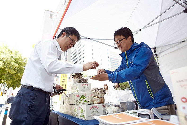 사회적 기업 ‘꼬마농부’ 이현수 대표는 만나는 한 분 한 분에게 “커피 찌꺼기를 재활용해서 버섯균을 배양하는 배지로 만들어 가지고요. 가정에서 직접 느타리버섯을 키워볼 수 있도록 키트로 개발한 것입니다”라고 이야기 했습니다.
