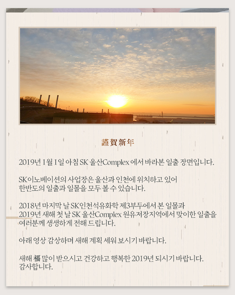 [영상] 2019년 새해 첫날, SK 울산Complex에서 바라본 일출 2019. 01. 01 SK이노베이션 1분 읽기 [영상] 2019년 새해 첫날, SK 울산Complex에서 바라본 일출 AI 요약 AI 보이스 ▲ SK인천석유화학에서 바라 본 2018년 마지막 일몰과 SK 울산Complex에서 맞은 2019년 첫 일출 미디어 키트 이전글 새해 울산Complex 일몰 일출 다음글 연관 콘텐츠 기업 뉴스 [SK innovation’s 2020] SKinno News meets the CEOs ⑧ – Taewon Kim, President of E&P Biz. 2020.02.24 INSIGHT PEOPLE & CULTURE Previous 기업 뉴스 프레스센터 “미래 모빌리티 산업의 Global Leading Company가 될 것이라는 확신이 들었습니다” – Fanny Deplace의 CES 2020 참관기 2020.01.28 INNO FOCUS CES 2019 현장을 사로잡은 SK이노베이션 – 관람객 인터뷰 2019.01.11 PRESS SK이노베이션, 배터리 신규 공장 설립 위해 美 조지아 州와 MOU 체결 2019.01.05