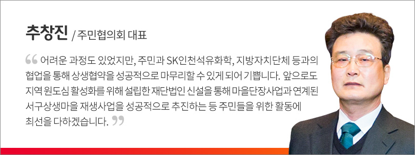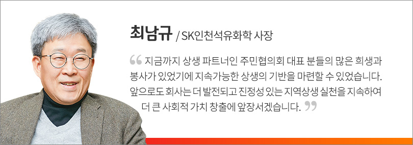 SK인천석유화학의 성장과 발전에 주민협의회가 협력하는 내용 또한 협약서에 담았다. 이번 협약 체결은, 그동안 신설 공장 증설로 인한 지역 주민과의 어려움도 있었지만 상생으로 패러다임을 전환했다는 점에서 그 의미가 깊다.