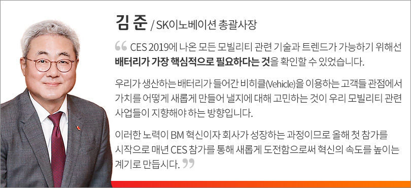 SK이노베이션 김준 총괄사장은 1월 9일(현지 시간) CES 현장에서 윤예선 배터리사업 대표, 노재석 소재사업 대표를 비롯한 각 사업 전략 담당 임원들과 가진 전략 회의에서 기술혁신 속도가 훨씬 빠르다는 것을 실감해 BM 혁신의 속도를 높여야 한다고 말했다.