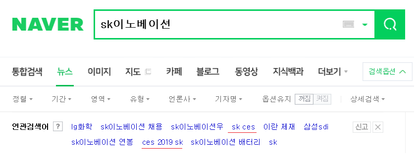포털창에 SK이노베이션을 검색하면 ‘SK CES’, ‘CES2019 SK’ 등이 연관검색어로 함께 노출된다 (출처: NAVER 검색창 캡처 화면)