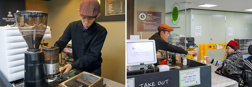 김정환씨는 지난해 9월, 커리어 점프업 클래스에서 바리스타 과정을 약 4개월간 진행한 뒤 12월 수료와 동시에 바리스타로 취업에 성공했다. 서울북부장애인종합복지관의 카페 ‘꿈틀’에서 바리스타로 성장하고 있는 김정환 씨를 만났다.