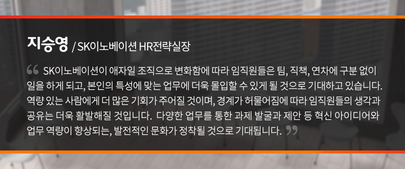 효과적이고 빠른 의사결정이 가능한 조직 형태로의 변화를 통해 불확실한 경영 환경 속에서도 ‘딥체인지(Deep Change)’를 추진하기 위해 도입한 SK이노베이션의 애자일 조직. 지난해 일부 조직에서 시범적으로 운영한 바를 토대로 올해부터는 전사적으로 확대한 만큼, SK이노베이션의 ‘일하는 방식의 혁신’이 더욱 가속화될 것으로 기대된다.
