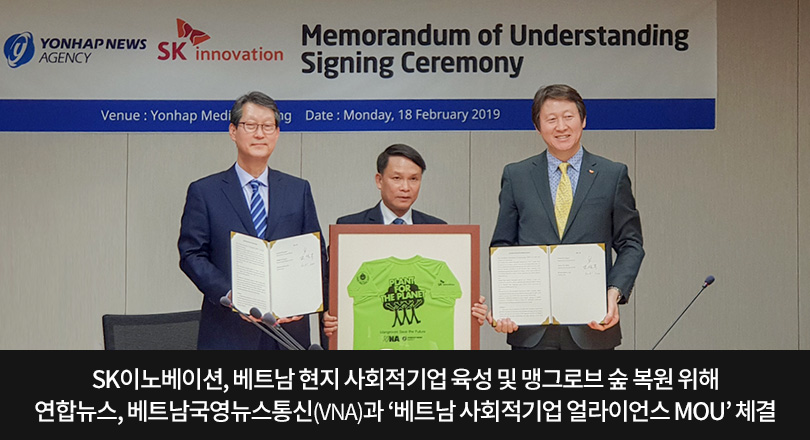 SK이노베이션이 2월 18일, 국가기간뉴스통신사인 연합뉴스, 베트남 국영뉴스통신(Vietnam News Agency, 이하 VNA)과 함께 베트남 맹그로브 숲 복원 및 사회적기업 육성을 지원하기 위해 ‘베트남 사회적기업 얼라이언스(Alliance) MOU’를 체결했다.