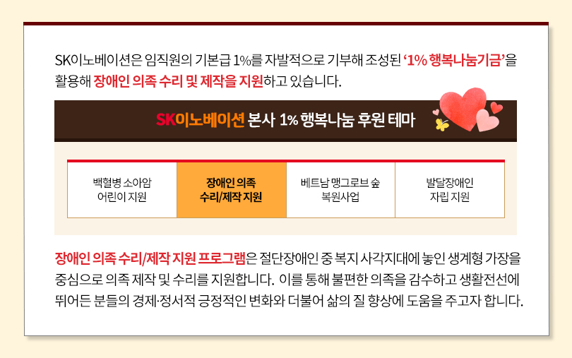 더 많은 사람들 앞에서 공연할 수 있도록, 도전할 수 있도록 의족 수리를 지원해준 SK이노베이션에게 큰 감사를 전한 정원민 마술사. 앞으로도 SK이노베이션의 1% 행복나눔은 이처럼 복지 사각지대에 놓여있는 장애인들이 ‘꿈’을 포기하지 않고 이뤄나갈 수 있도록 아낌없는 지원을 계속할 예정이다.