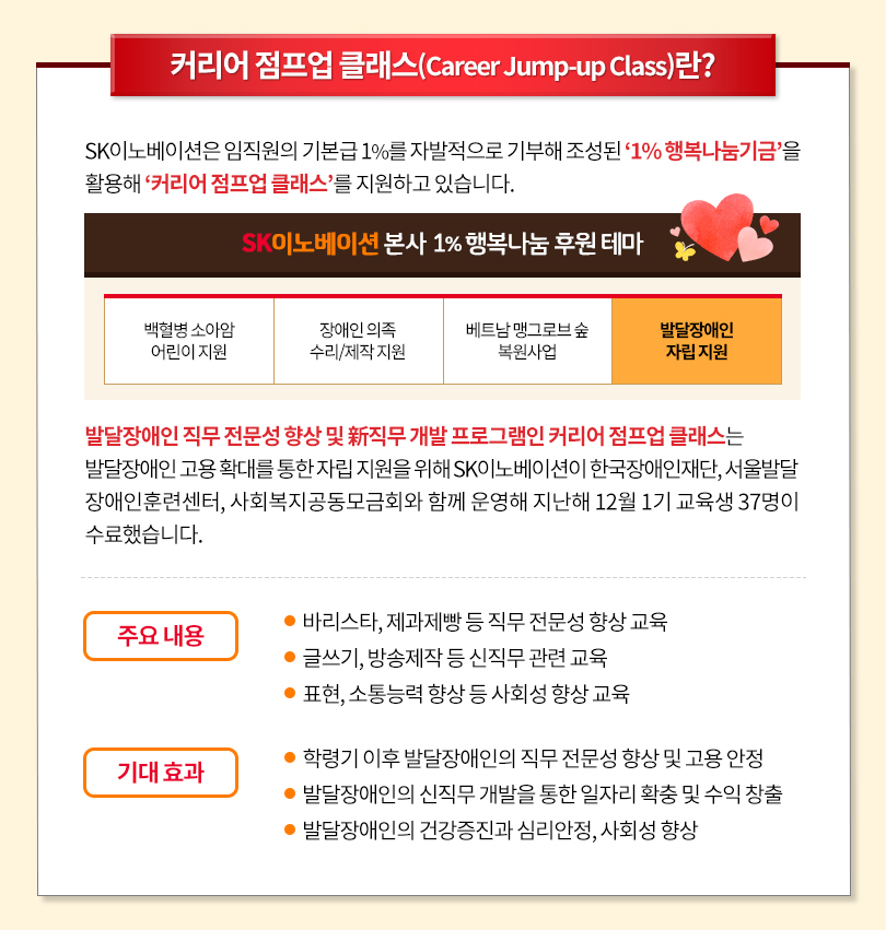 발달장애인들을 대상으로 한 커리어 점프업 클래스는 바리스타 외에도 제과제빵, 방송글쓰기, 방송스피치, 방송제작 등의 교육 과정을 제공하고 있으며, 1기 졸업생 37명 중 22명이 취업에 성공했다. SK이노베이션은 올해 상반기 중에 2기 수강생을 모집할 계획이다.