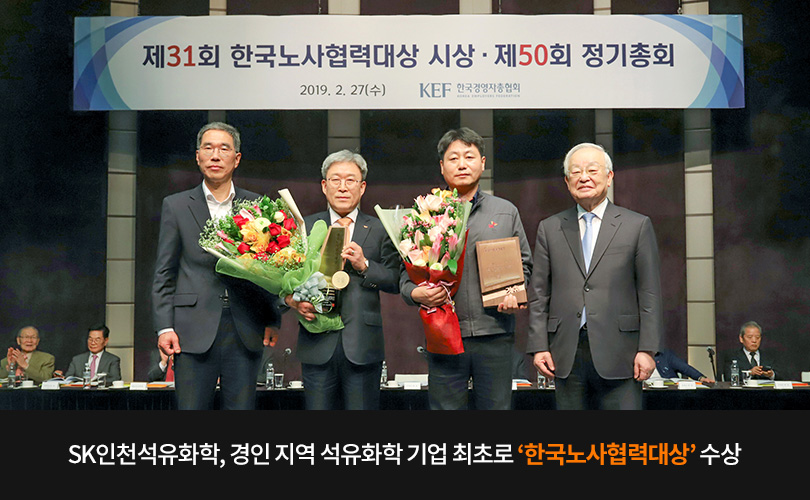 상호신뢰의 노사(勞使)문화를 기반으로 협력사와의 동반성장과 지역 상생에 앞장서 온 SK인천석유화학이 경인 지역 석유화학 기업 최초로 ‘한국노사협력대상’ 에서 ‘대기업 부문 대상’을 수상했다. 2월 27일, 한국경영자총협회(이하 한국경총)가 주관한 ‘제31회 한국노사협력대상’ 시상식에는 손경식 한국경총회장, 김주영 한국노총(한국노동조합총연맹) 위원장 등 관계자 250여 명이 참석했다.