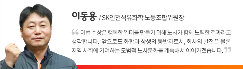 SK인천석유화학은 상호신뢰 기반의 협력적 노사관계를 바탕으로, 회사의 발전에 앞장서고 동반성장, 사회공헌 활동 등 사회적가치 창출을 위해 지속적으로 노력한 점을 인정받아 올해 대기업부문 대상을 수상했다.