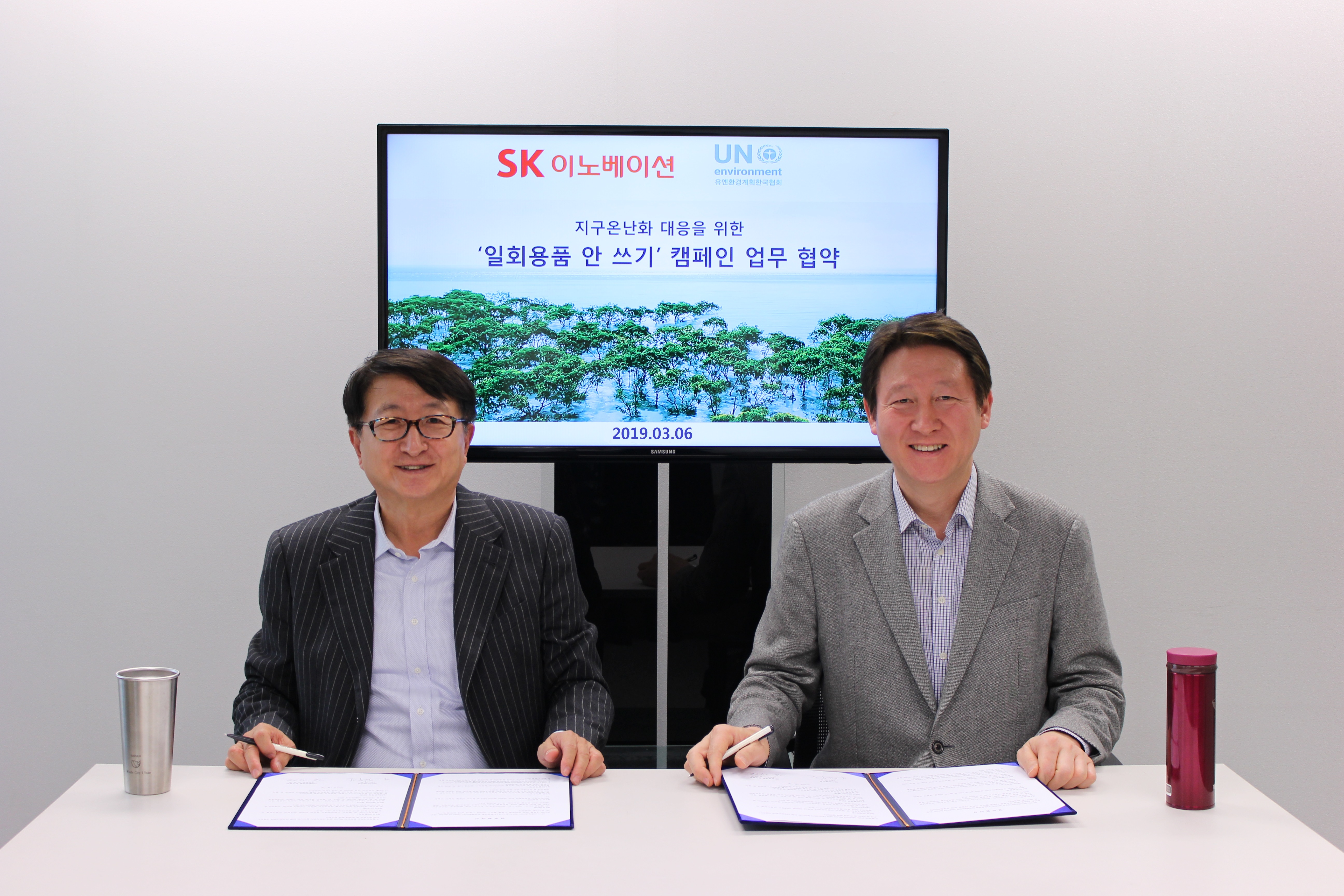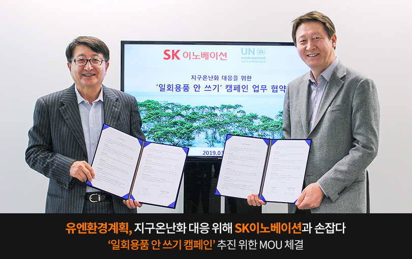 SK이노베이션이 유엔환경계획한국협회(이하 ‘유엔환경계획’)와 ‘일회용품 안쓰기 캠페인’ 추진을 위한 MOU를 체결하고 지구온난화 대응 및 환경 보호를 위한 선제적 대응 방침을 밝혔다.